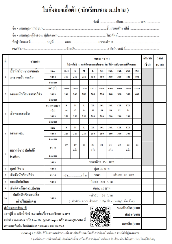 | ใบสั่งจองชุดนักเรียนชาย ม.ปลาย | ดาวน์โหลด | 0.31 MB | 112 | 31 มี.ค. 63 |